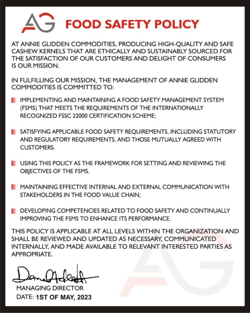 Annie Glidden Commodities is an agricultural trading company based in Chicago, USA. We also operate trading offices in 3 West African countries (Nigeria, Ghana and Benin). We source our agricultural commodities from these countries and supply to companies worldwide. After 6 years of exporting raw commodities out of West Africa, we put a plan in motion to add value to the various agricultural commodities. We decided to start with raw cashew nuts because we have a comparitive advantage by processing it in West Africa where they are grown. By processing the raw cashew nuts where they are produced, we have a competitive advantage with quality, pricing, shipment, carbon footprint and traceability.